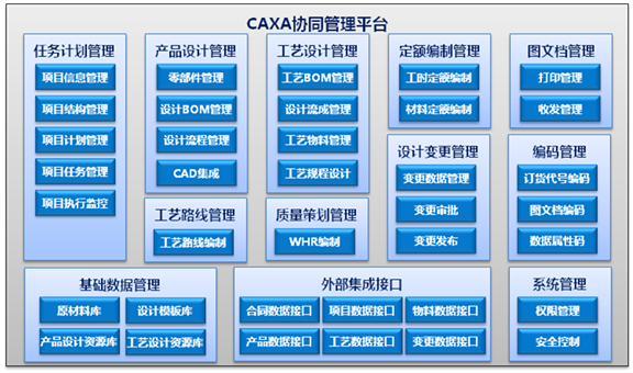 整個PDM系統(tong)基(ji)于CAXA協同管理(li)平(ping)臺的(de)架構,實(shi)現以下主要功(gong)能(neng)模(mo)塊: