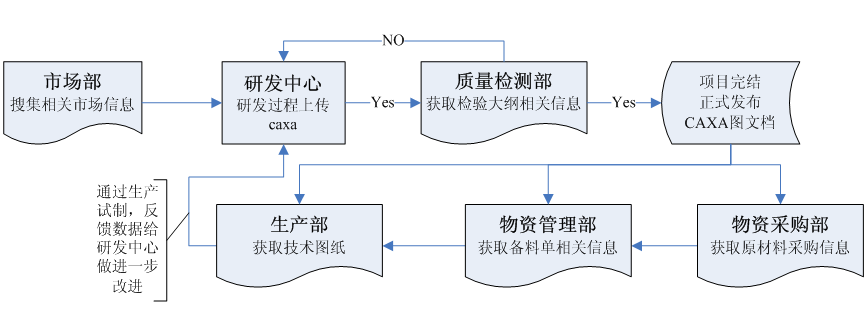 從圖一(yi)可以看出,項目研發(fa)(fa)完結,正式(shi)發(fa)(fa)布之后,各部(bu)門都可以通過caxa圖文(wen)檔(dang)快速(su)實現圖紙調用功(gong)能(neng)(neng),生產部(bu)在生產過程中(zhong)發(fa)(fa)現問題(ti)還能(neng)(neng)及時反饋給開發(fa)(fa)部(bu)門及時整改。