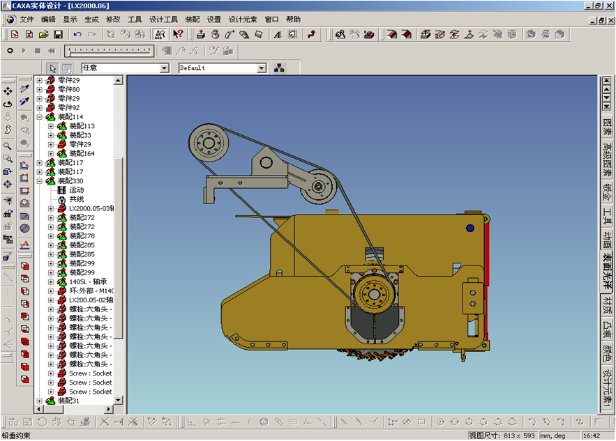 在(zai)(zai)對銑刨滾筒 、罩殼(ke)總(zong)成及(ji)(ji)傳動系(xi)統總(zong)成的(de)(de)(de)(de)(de)裝(zhuang)(zhuang)(zhuang)(zhuang)配(pei)(pei)(pei)(pei)中(zhong),項目(mu)組充分運用(yong)(yong)了(le)(le)CAXA實(shi)體設計(ji)系(xi)統提供(gong)的(de)(de)(de)(de)(de)三維(wei)球(qiu)裝(zhuang)(zhuang)(zhuang)(zhuang)配(pei)(pei)(pei)(pei)、無約(yue)(yue)束裝(zhuang)(zhuang)(zhuang)(zhuang)配(pei)(pei)(pei)(pei)、約(yue)(yue)束裝(zhuang)(zhuang)(zhuang)(zhuang)配(pei)(pei)(pei)(pei)三種裝(zhuang)(zhuang)(zhuang)(zhuang)配(pei)(pei)(pei)(pei)方式。項目(mu)組成員一致(zhi)認(ren)為(wei)三維(wei)球(qiu)使用(yong)(yong)時(shi)的(de)(de)(de)(de)(de)“得心應(ying)手,隨心所欲”及(ji)(ji)其裝(zhuang)(zhuang)(zhuang)(zhuang)配(pei)(pei)(pei)(pei)效率是目(mu)前其它(ta)三維(wei)軟(ruan)件不可(ke)比擬的(de)(de)(de)(de)(de),同(tong)時(shi)也是CAXA實(shi)體設計(ji)系(xi)統靈(ling)魂之所在(zai)(zai)。除(chu)三維(wei)球(qiu)外,利用(yong)(yong)無約(yue)(yue)束及(ji)(ji)約(yue)(yue)束裝(zhuang)(zhuang)(zhuang)(zhuang)配(pei)(pei)(pei)(pei)結合系(xi)統提供(gong)的(de)(de)(de)(de)(de)裝(zhuang)(zhuang)(zhuang)(zhuang)配(pei)(pei)(pei)(pei)生成工(gong)具(ju)也是裝(zhuang)(zhuang)(zhuang)(zhuang)配(pei)(pei)(pei)(pei)過(guo)程中(zhong)一個(ge)行之有效的(de)(de)(de)(de)(de)裝(zhuang)(zhuang)(zhuang)(zhuang)配(pei)(pei)(pei)(pei)途徑。另外,傳統的(de)(de)(de)(de)(de)三維(wei)設計(ji)軟(ruan)件在(zai)(zai)裝(zhuang)(zhuang)(zhuang)(zhuang)配(pei)(pei)(pei)(pei)時(shi)往往約(yue)(yue)束重(zhong)(zhong)(zhong)重(zhong)(zhong)(zhong),造(zao)成后(hou)期修(xiu)改(gai)極為(wei)困(kun)難,修(xiu)改(gai)后(hou)經(jing)常需要對各零部件進(jin)(jin)行重(zhong)(zhong)(zhong)新造(zao)型或重(zhong)(zhong)(zhong)新裝(zhuang)(zhuang)(zhuang)(zhuang)配(pei)(pei)(pei)(pei),重(zhong)(zhong)(zhong)復工(gong)作量(liang)大。這(zhe)一點在(zai)(zai)CAXA實(shi)體設計(ji)XP系(xi)統中(zhong)得到了(le)(le)很好的(de)(de)(de)(de)(de)解(jie)決(jue),在(zai)(zai)裝(zhuang)(zhuang)(zhuang)(zhuang)配(pei)(pei)(pei)(pei)過(guo)程和后(hou)期需要對裝(zhuang)(zhuang)(zhuang)(zhuang)配(pei)(pei)(pei)(pei)體進(jin)(jin)行修(xiu)改(gai)時(shi),利用(yong)(yong)系(xi)統的(de)(de)(de)(de)(de)三種裝(zhuang)(zhuang)(zhuang)(zhuang)配(pei)(pei)(pei)(pei)方式可(ke)以非常靈(ling)活(huo)的(de)(de)(de)(de)(de)對已經(jing)進(jin)(jin)行過(guo)的(de)(de)(de)(de)(de)裝(zhuang)(zhuang)(zhuang)(zhuang)配(pei)(pei)(pei)(pei)進(jin)(jin)行調整,同(tong)時(shi)原有的(de)(de)(de)(de)(de)約(yue)(yue)束關(guan)系(xi)仍然保留。這(zhe)種裝(zhuang)(zhuang)(zhuang)(zhuang)配(pei)(pei)(pei)(pei)的(de)(de)(de)(de)(de)靈(ling)活(huo)性對大型的(de)(de)(de)(de)(de)裝(zhuang)(zhuang)(zhuang)(zhuang)配(pei)(pei)(pei)(pei)體特別重(zhong)(zhong)(zhong)要,它(ta)將最為(wei)有效的(de)(de)(de)(de)(de)減少裝(zhuang)(zhuang)(zhuang)(zhuang)配(pei)(pei)(pei)(pei)工(gong)作量(liang)并提高設計(ji)效率。