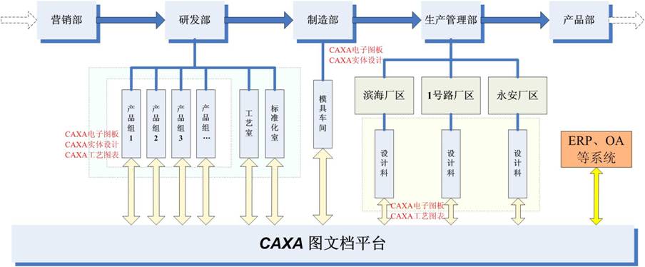 利(li)歐公(gong)(gong)司濱海主(zhu)廠區、新廠區(1號路廠區)、永安廠區彼(bi)此均相(xiang)隔數公(gong)(gong)里,而(er)且研發部(bu)(bu)根據(ju)不同產(chan)品分(fen)為水(shui)泵(beng)項目(mu)組(zu)、園林項目(mu)組(zu)、電機項目(mu)組(zu)、特(te)種泵(beng)項目(mu)組(zu)和(he)凈水(shui)設(she)備組(zu),所以解決各廠區間、研發部(bu)(bu)內(nei)部(bu)(bu)的(de)(de)協同設(she)計成為利(li)歐公(gong)(gong)司PLM方案(an)(an)的(de)(de)主(zhu)線(xian),根據(ju)利(li)歐的(de)(de)情況,方案(an)(an)的(de)(de)整體思(si)路以CAXA圖文(wen)檔(dang)管理系統(tong)(tong)為平(ping)臺,將公(gong)(gong)司原(yuan)來分(fen)散在三個(ge)廠區的(de)(de)研發部(bu)(bu)、技術科(ke)、生產(chan)部(bu)(bu)、市場部(bu)(bu)等在圖文(wen)檔(dang)系統(tong)(tong)中實現(xian)集中的(de)(de)數據(ju)共享和(he)管理。CAXA PLM方案(an)(an)架構如下: